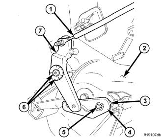 Remove the screw and washer (6) that secures the blend door cable lever (7) to the air distribution housing and remove the cable lever.