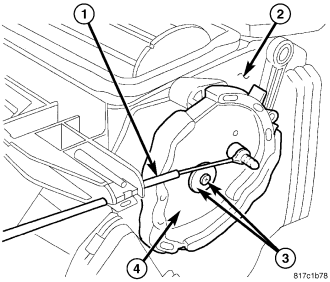 Remove the screw and washer (3) that secure the mode door cam (4) to the air distribution housing and remove the cam.