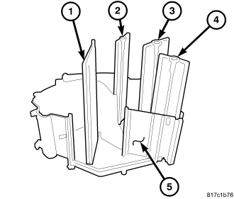 Disengage the air door(s) (1, 2, 3 and 4) from the mode door levers and remove the air doors from the air distribution housing (5).