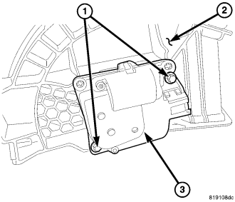 Install the two screws (1) that secure the recirculation door actuator (3) to the air inlet housing (2). Tighten the screws to 1.2 Nm (10 in. lbs.).