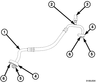 The A/C discharge line (1) is the refrigerant line that carries refrigerant from the A/C compressor to the A/C condenser. The A/C discharge line contains a fitting (2) for the A/C pressure transducer (3) and is secured to the A/C compressor and the A/C condenser by use metal fittings (4).