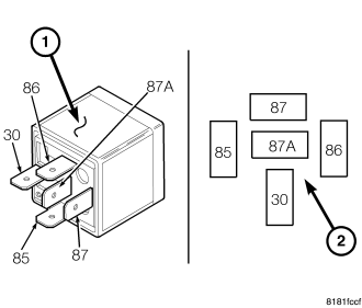 Three relays (1) are used for the electric positive temperature coefficient (PTC) heater system when equipped with the 2.8L diesel engine. The relays are International Standards Organization (ISO)-type relays. Relays conforming to the ISO specifications have common physical dimensions, current capacities, terminal functions and patterns (2). The PTC relays are electromechanical devices that switch fused battery current directly to the heating elements of the PTC heater unit. The PTC relays are energized by control circuits of the totally integrated power module (TIPM).