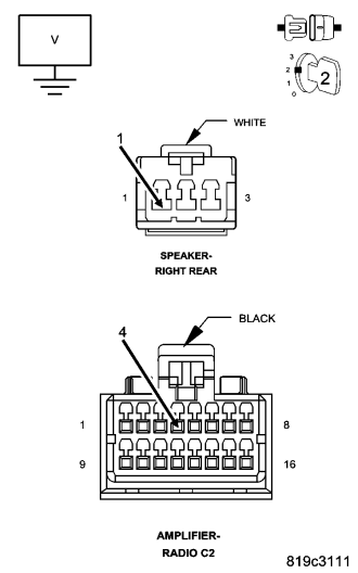Measure for voltage on the (X296) Amplified Right Rear Speaker (-) circuit.