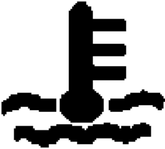 The engine temperature indicator consists of a stencil-like cutout of the International Control and Display Symbol icon for Engine Coolant Temperature in the opaque layer of the instrument cluster overlay. The dark outer layer of the overlay prevents the indicator from being clearly visible when it is not illuminated. A red Light Emitting Diode (LED) behind the cutout in the opaque layer of the overlay causes the indicator to appear in red through the translucent outer layer of the overlay when it is illuminated from behind by the LED, which is soldered onto the instrument cluster electronic circuit board.
