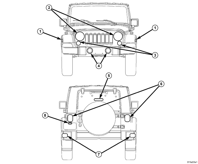 Center High Mounted Stop Lamp (5) - A standard equipment Center High Mounted Stop Lamp (CHMSL) is mounted to a stanchion that is integral to the spare tire carrier centered on the