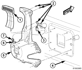 Remove the four screws (2) from the forward facing surface of the stanchion on the spare tire carrier (5) that secure the CHMSL (1).
