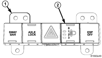 The headlamp leveling switch (2) is used only on vehicles manufactured for certain markets where the headlamp leveling system is required. The headlamp leveling switch is integral to the switch pod (1) on the instrument panel. A stencil-like International Control and Display Symbol icon for Headlamp Levelling Control identifies the headlamp leveling switch button. The switch push button is also marked with the numbers 0, 1, 2, and 3, which indicates each of the four headlamp leveling positions. Each higher number represents a lower aiming position of the headlamp beam relative to the road surface.
