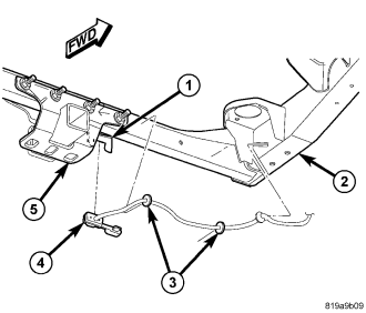 Vehicles equipped with an optional Trailer Tow package have a trailer tow wiring harness (3) connected between the body wire harness take out for the left rear lamp and the left rear lamp unit. The trailer tow wiring is routed through the left rear lamp cavity of the body to the left rear frame rail (2) then back to the rear crossmember. The wiring is secured to the frame rail and crossmember with molded plastic offset clips. A molded rubber four-way connector and cover (4) are pushed into a stamped metal tab bracket (1) that is welded to the left side of the trailer hitch receiver platform (5).