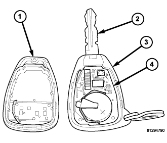 Each ignition key (2) used in the Sentry Key Immobilizer System (SKIS) has a transponder chip included on the circuit board (4) beneath the cover (1) of the integral Remote Keyless Entry (RKE) transmitter (3). In addition to having to be cut to match the mechanical coding of the ignition lock cylinder and programmed for operation of the RKE system, each new Sentry Key has a unique transponder identification code that is permanently programmed into it by the manufacturer, and which must be programmed into the Sentry Key REmote Entry Module (SKREEM) (also known as the Wireless Control Module/WCM) to be recognized by the SKIS as a valid key.