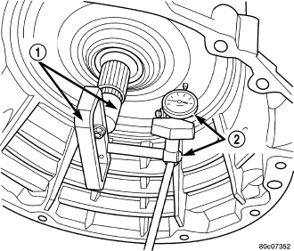 NOTE: When measuring the input shaft end-play, two "stops" will be felt. When the input shaft is pushed inward and the dial indicator zeroed, the first "stop" felt when the input shaft is pulled outward is the movement of the input shaft in the input clutch housing hub. This value should not be included in the end-play measured value and therefore must be recorded and subtracted from the dial indicator reading.