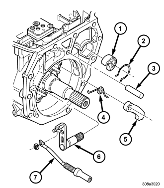 44. Remove the park pawl pivot shaft (3), park pawl (5), and spring (4).