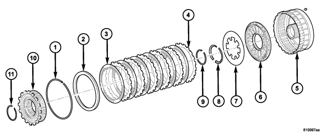 Assemble and install the low/reverse clutch pack (3, 4) into the low/reverse clutch retainer (5).