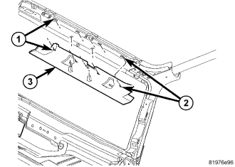 2. Using a trim stick C-4755 or equivalent, separate the retaining clips (1) and (2) and remove the windshield molding (3).