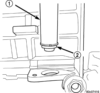 43. Using Adapter 8266-1 from End-Play Tool Set 8266 (1) and Dial Indicator C-3339 (2), measure and record the input shaft end-play. The correct end-play is 0.46-0.89 mm (0.018-0.035 in.). Adjust as necessary. Install the chosen thrust plate on the number 5 thrust bearing and re-measure end-play to verify selection.