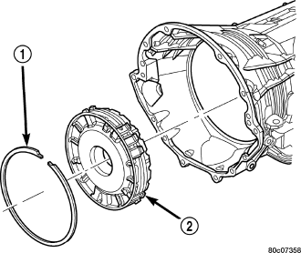 10. Install the flat 2C clutch snap-ring (1) into the transmission case.