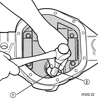 Remove rear bearing cup (1) and oil baffle with a hammer and punch (2).