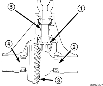 Differential side bearing preload and gear backlash is accomplish with selective shims (2,4) positioned behind the differential side bearing cups. Shim thickness is determined using Dummy Bearings D-348 in place of the differential side bearings, Dummy Shims 8107 and a Dial Indicator C-3339A.