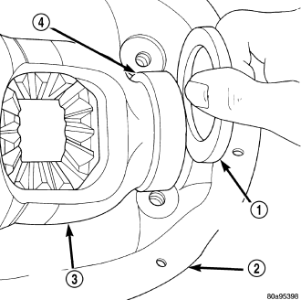 27. Install differential case (2) with bearing cups (3) in the housing (1).