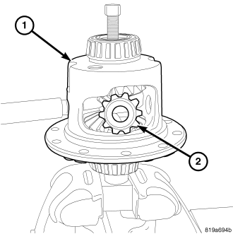 Clamp side gear Fixture 6963A (1) in a vise and set differential case (2) on the fixture.
