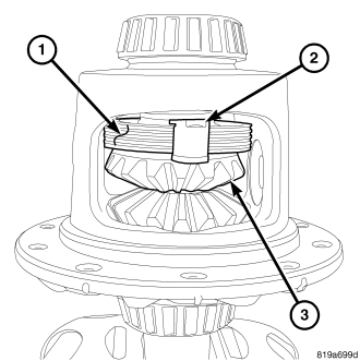 Lubricate and install disc (1) with threaded hole from Trac-lok Tool C-4487 into upper side gear (2). Thread forcing screw (3) from Trac-lok Tool C-4487 into upper disc until it contacts