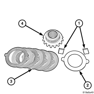 Remove clutch pack retainers (1), clutch pack (3) belleville spring (2) from side gear (4). Keep plates in order during removal.