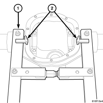 Install Pin C-3288-B at the left side of the differential housing. Attach Dial Indicator C-3339A (1) to pin. Load the indicator plunger (2) against the opposite side of the housing and zero the