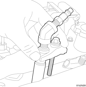 Prepare special tool MD998772A (1) for usage by inverting the tool to cylinder head holding screws so that the thread size matches the cylinder head.