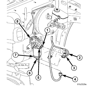 The fuel filter/water separator assembly (8) is located on the left-rear side of the engine compartment. The assembly includes the fuel filter (7), fuel heater (1), fuel temperature sensor (5), combination water drain valve/Water-In-Fuel (WIF) sensor (6), and a quick-connect fittings attached at the side of the fuel filter canister.
