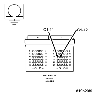 Measure the resistance of the (R44) Passenger Squib 1 Line 1 circuit between the ORC 8443-32-L Adaptor cavity C1-11 and ground.
