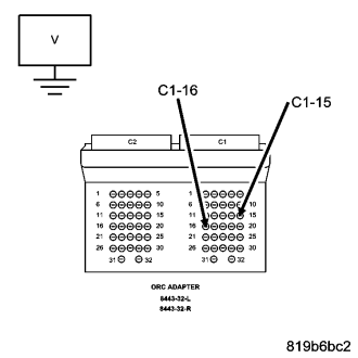 Measure the voltage of the (R62) Passenger Squib 2 Line 2 circuit between the 8443-32-L adaptor cavity C1-16 and ground.