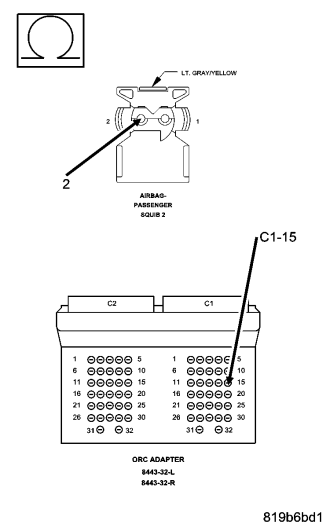 Measure the resistance of the (R64) Passenger Squib 2 Line 1 circuit between the Passenger Airbag Squib connector and the 8443-32-L ORC Adaptor cavity C1-15.