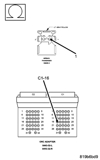 Measure the resistance of the (R62) Passenger Squib 2 Line 2 circuit between the Passenger Airbag Squib connector and the 8443-32-L ORC Adaptor cavity C1-16.