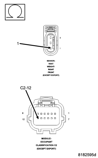 Measure the resistance of the (R728) Seat Weight Sensor Ground circuit between the OCM C2 connector and the Right-Front Seat Weight Sensor connector.