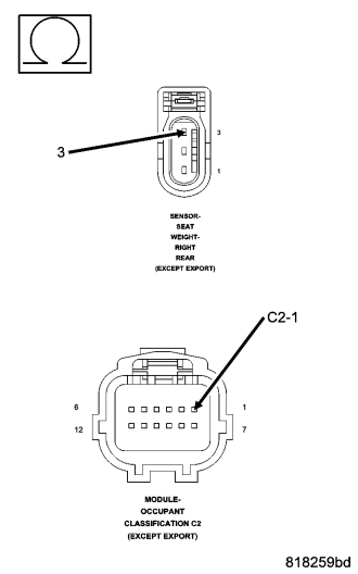 Measure the resistance of the (R701) Seat Weight Sensor 5 Volt circuit between the OCM C2 connector and the Right-Rear Seat Weight Sensor connector.