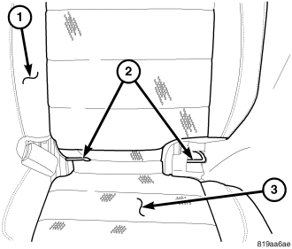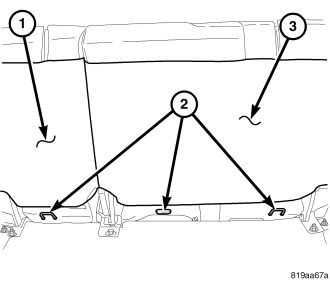 The upper tether anchors (2) are each integral to the second row seat cushion frames. One anchor is located on the 40 percent seat (1) and 2 are located on the 60 percent seat (3). These anchors are each constructed from a heavy-gauge steel wire loop that is securely welded to the seat cushion frames. The child restraint upper tether anchors cannot be adjusted or repaired and, if ineffective or damaged, they must be replaced as a unit with their respective second row seat cushion frames.