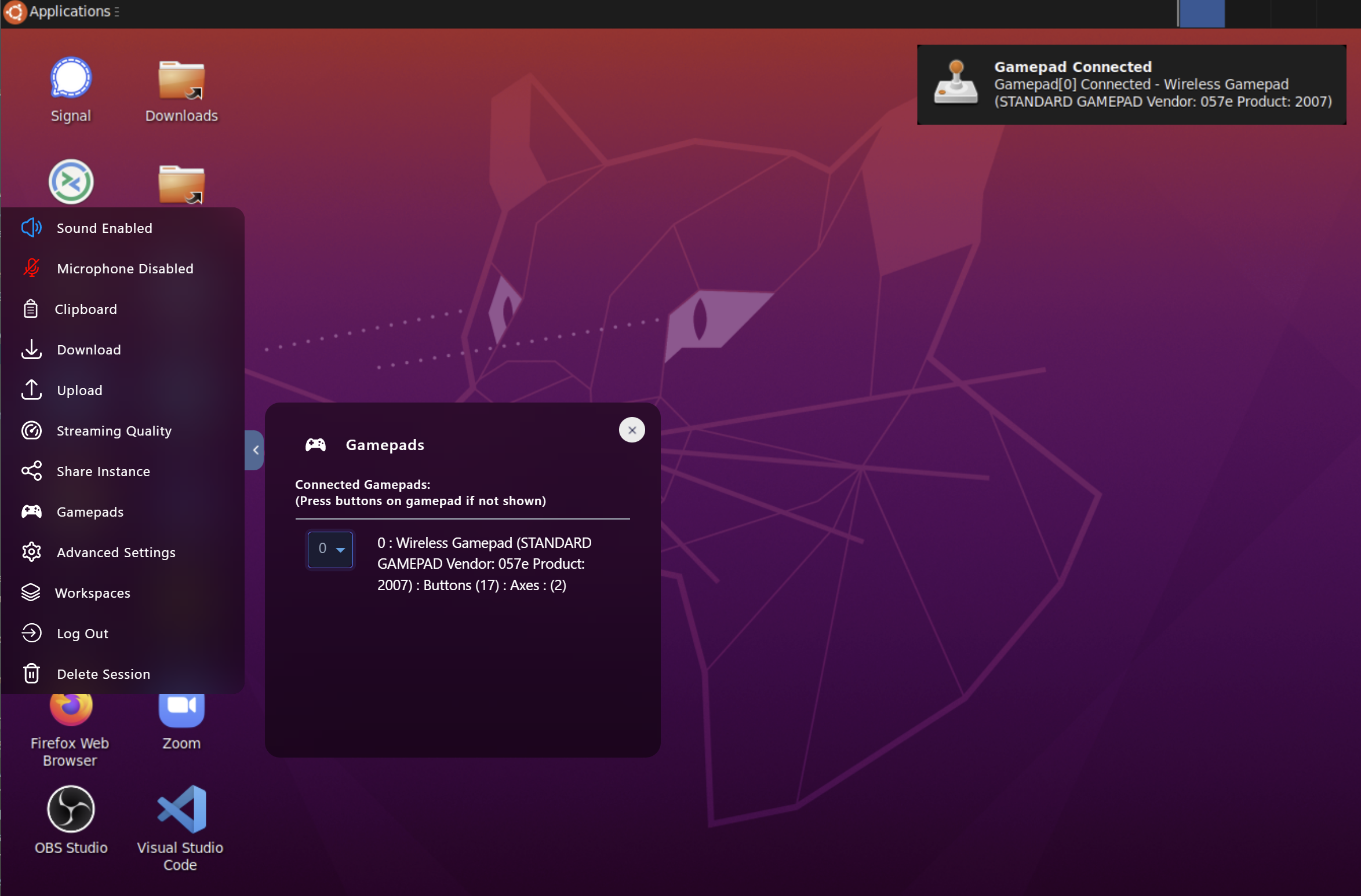 Workspaces supports passing through up to 4 gamepads into the Kasm sessions. Participants in shared sessions may also pass through gamepads.