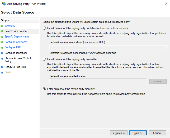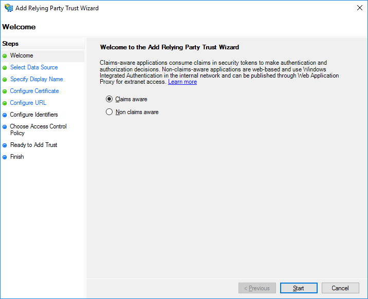 Right-Click Relying Party Trusts and select Add Relying Party Trust. The wizard will open.
