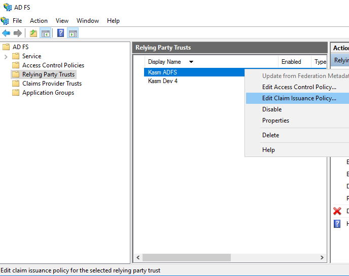 From the ADFS management console, select Relying Party Trusts, right click trust previously configured (.e.g Kasm ADFS) and select Edit Claim Issuance Policy.
