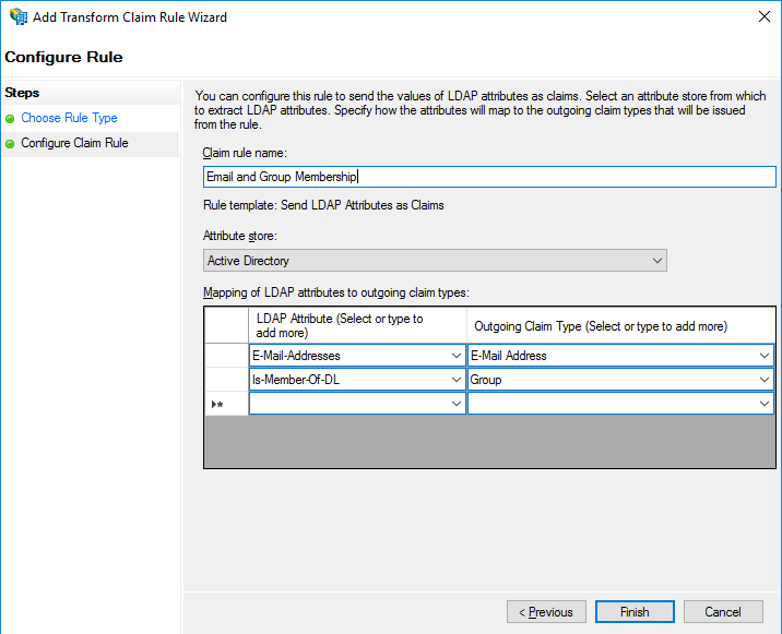 In another entry, select Is-Member-Of-DL in LDAP Attribute and select Group in the Outgoing Claim Type. Click Finish.