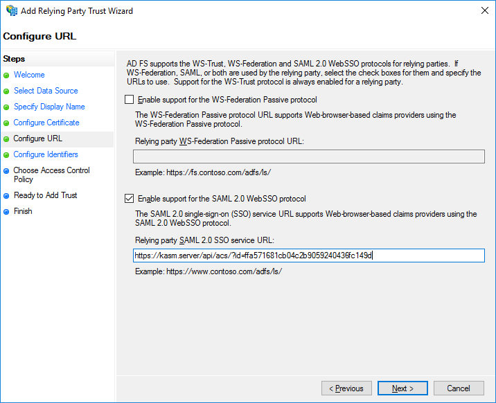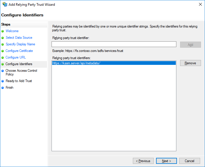 In the Relay party trust identifier, enter the Entity ID from the Service Provider section from the Kasm SAML configuration page started in the previous section. Click Add, then Click Next.