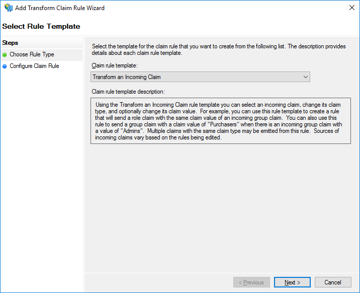 Select Transform an Incoming Claim from the Claim rule template dropdown. Click Next.