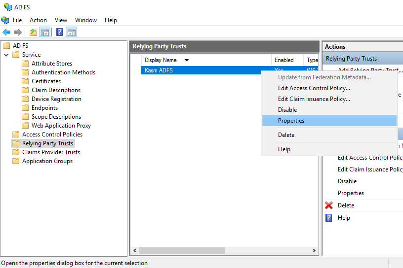 Right click the new trust (e.g Kasm ADFS) and select Properties.
