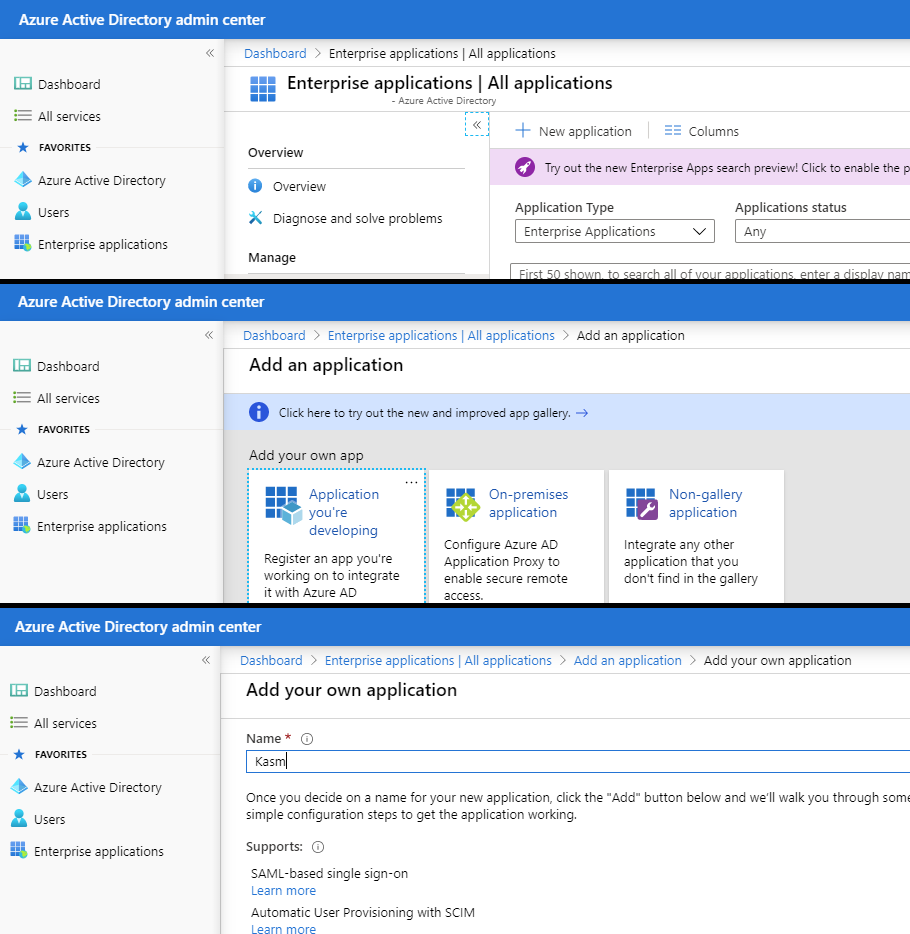 Click the New Application button and select Non-Gallery application. Provide a name. e.g (Kasm) and click Add