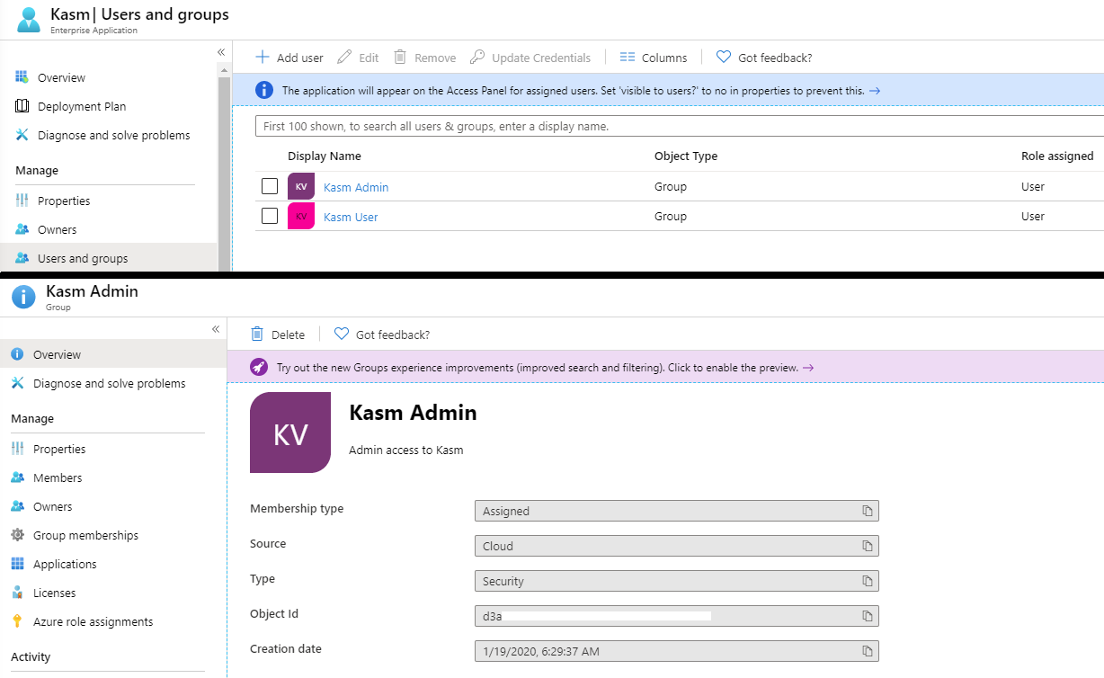 In this example, a Kasm Users and Kasm Admin groups were defined.