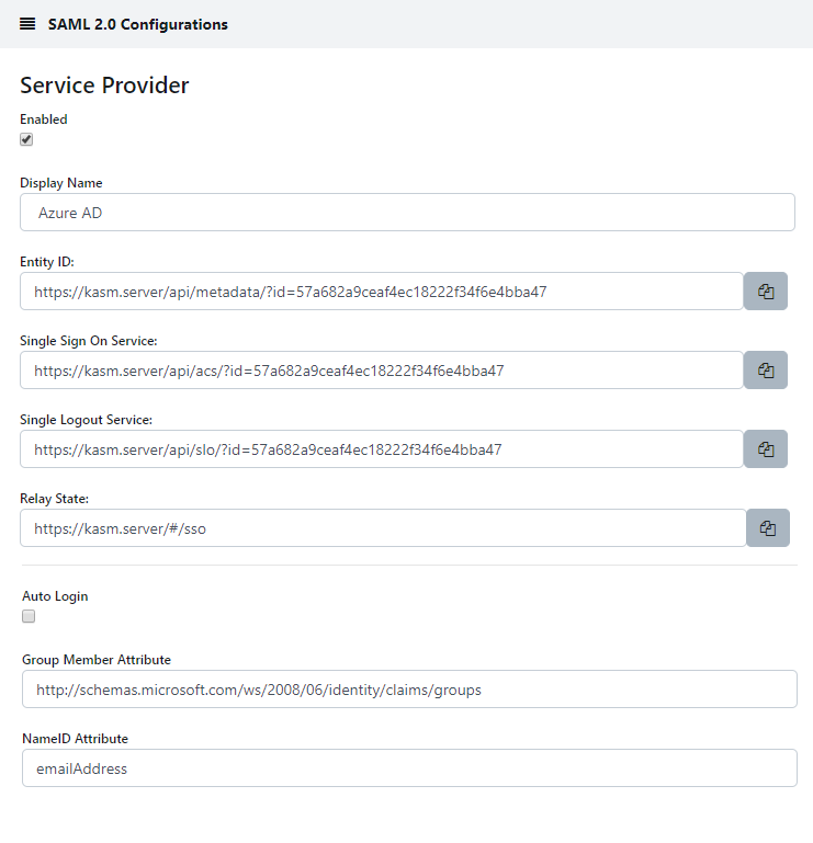 The SAML 2.0 Configuration page will auto-generate the Entity ID, Single Sign On Service, Single Logout Server, and Relay State values.