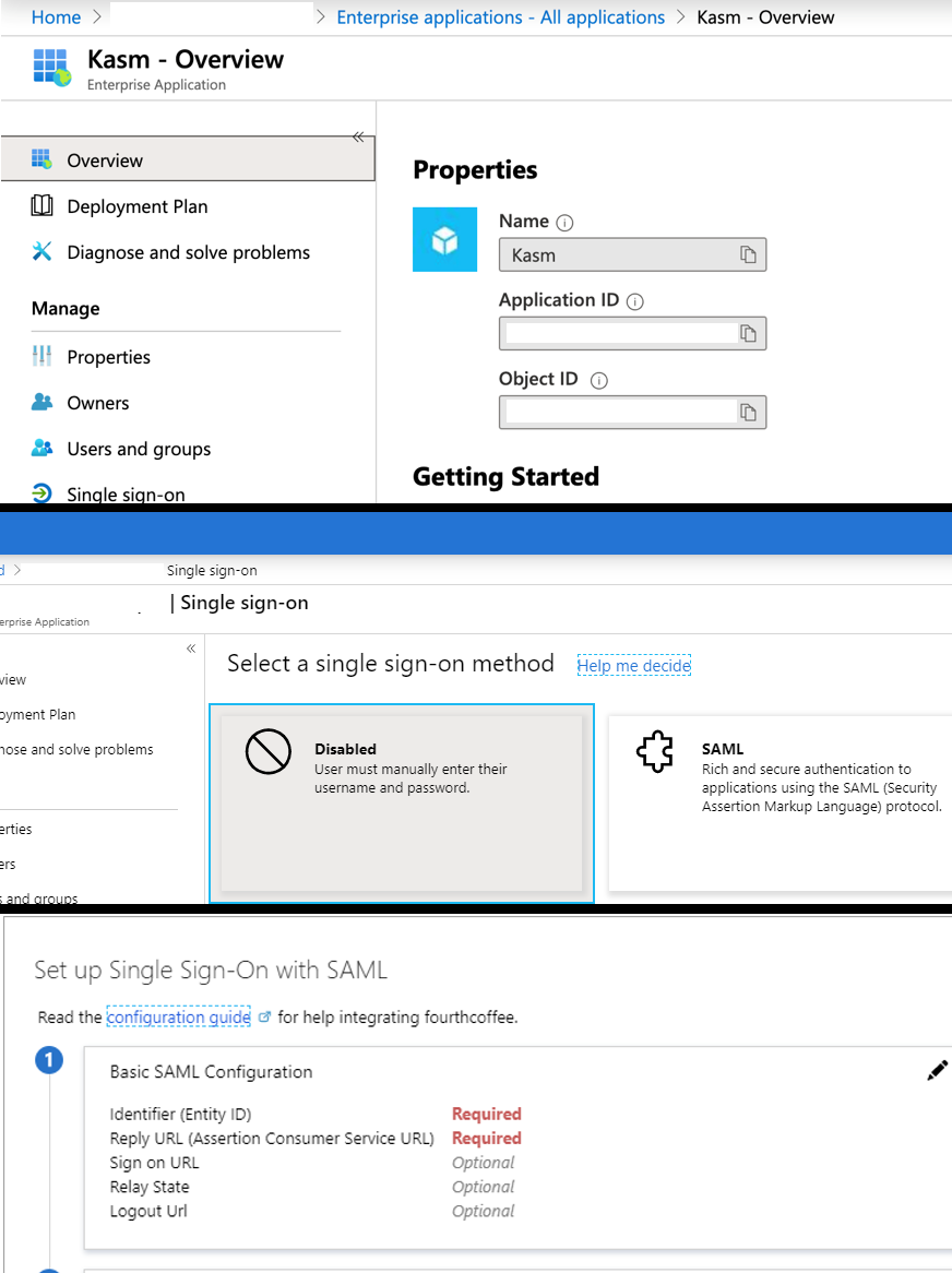 Copy the Service Provider entries from the Kasm SAML Configurations started in the previous section into the Basic SAML configurations and click Save , and close the section.
