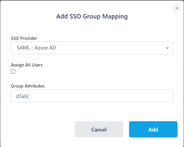 Select “SAML - Azure AD” as the SSO Provider and enter the Object Id for the desired Azure AD Security group previously configured into the Group Attributes field.