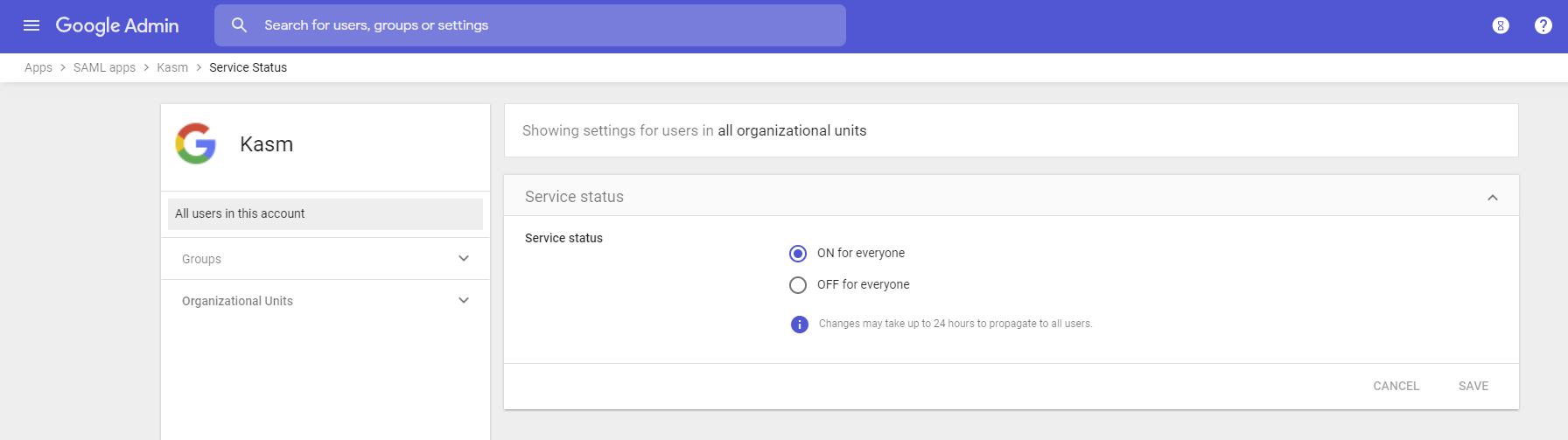 Once the Kasm SAML app is configured in GSuite, access must be grated to Google users.