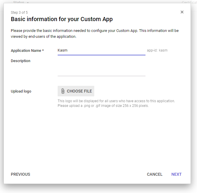 Click Next in the Google IdP Information window to be taken to the Basic Information for your Custom App section. Enter an Application Name (e.g Kasm) and click Next