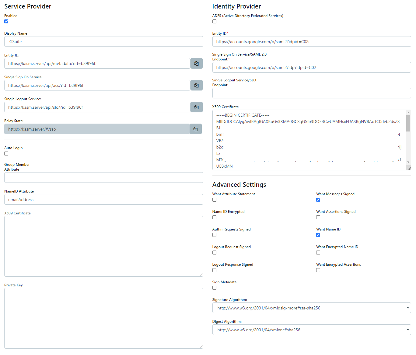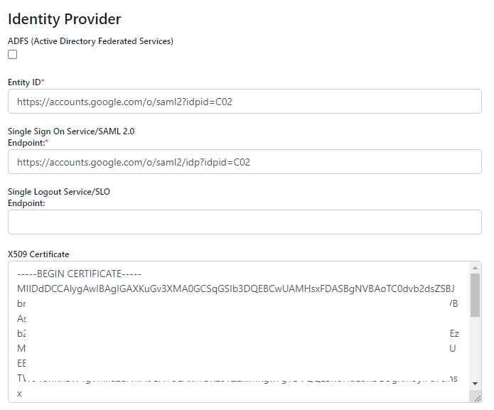 Copy the Google IdP entries to the Identity Provider section of the Kasm SAML Configurations started in the previous section.
